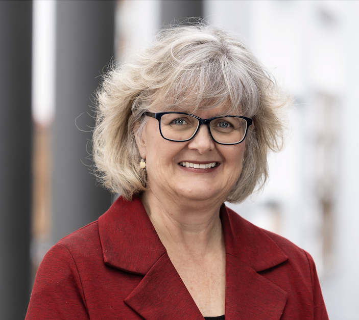 Roksolana Suchowerska, Senior Lecturer in Social Impact at the Centre for Social Impact, Swinburne, smiling in a brightly lit indoor setting. She has long, light brown hair and is wearing a colourful patterned top, with a warm and professional expression.